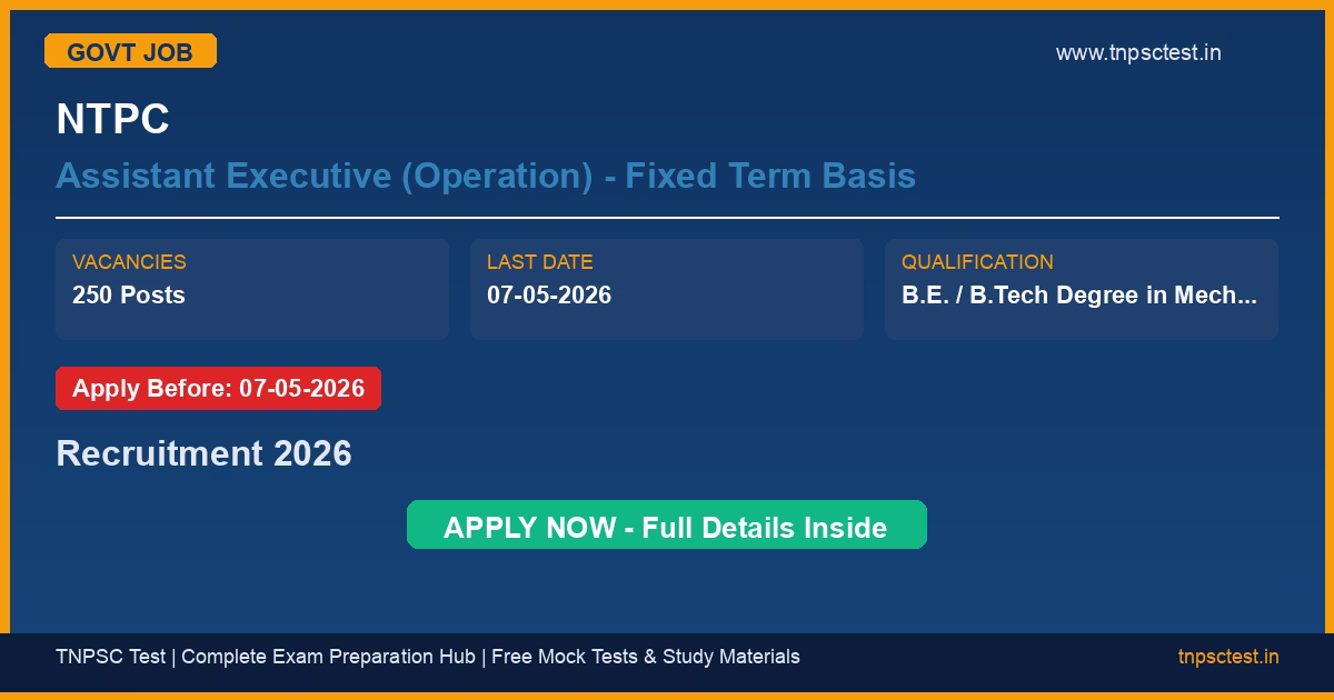 NTPC has released an official recruitment notification for the post of Assistant Executive (Operation) – Fixed Term Basis. A total of 250 Posts vacancies have been announced for this government recruitment 2026. Candidates who have completed B.E. / B.Tech Degree in Mechanical / Electrical Engineering with at least 40% marks from a recognised University/Institution from a recognized university or institution are eligible to apply. The last date to submit the online application is 07-05-2026. Read below for complete details on eligibility criteria, application fee, selection process, salary, and how to apply for this NTPC recruitment.