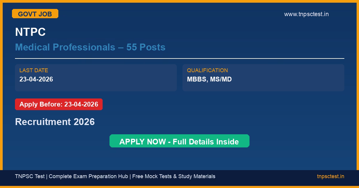 NTPC has released an official recruitment notification for the post of Medical Professionals – 55 Posts. Candidates who have completed MBBS, MS/MD from a recognized university or institution are eligible to apply. The last date to submit the online application is 23-04-2026. Read below for complete details on eligibility criteria, application fee, selection process, salary, and how to apply for this NTPC recruitment.