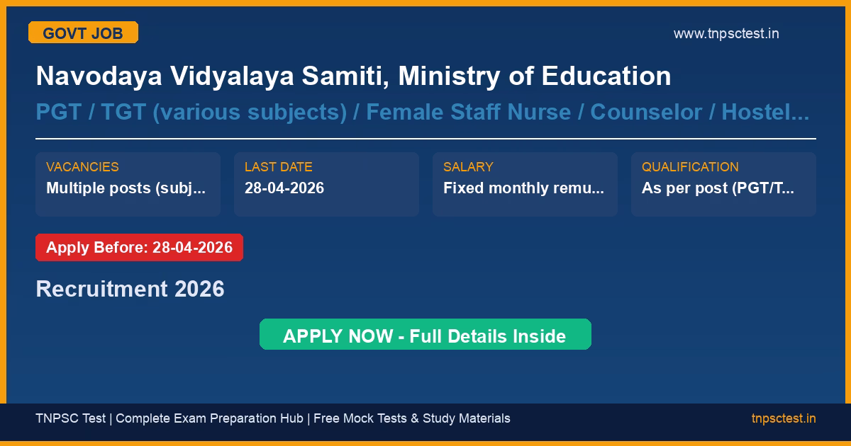 Navodaya Vidyalaya Samiti, Ministry of Education has released an official recruitment notification for the post of PGT / TGT (various subjects) / Female Staff Nurse / Counselor / Hostel Superintendent. A total of Multiple posts (subject-wise requirement in various JNVs under Shillong Region) vacancies have been announced for this government recruitment 2026. Candidates who have completed As per post (PGT/TGT: Integrated PG/Graduation + B.Ed. with 50% marks + CTET where applicable; detailed subject-wise in notification) from a recognized university or institution are eligible to apply. The last date to submit the online application is 28-04-2026. Read below for complete details on eligibility criteria, application fee, selection process, salary, and how to apply for this Navodaya Vidyalaya Samiti, Ministry of Education recruitment.
