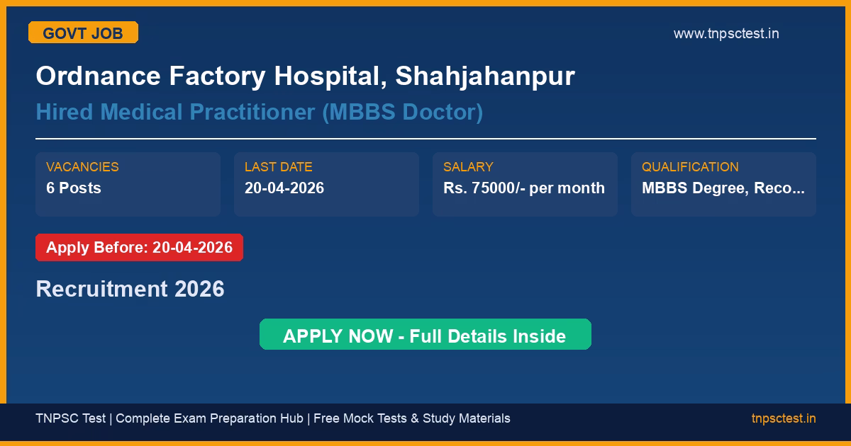 Ordnance Factory Hospital, Shahjahanpur has released an official recruitment notification for the post of Hired Medical Practitioner (MBBS Doctor). A total of 6 vacancies have been announced for this government recruitment 2026. Candidates who have completed MBBS Degree, Recognized by MCI. from a recognized university or institution are eligible to apply. The last date to submit the online application is 20-04-2026. Read below for complete details on eligibility criteria, application fee, selection process, salary, and how to apply for this Ordnance Factory Hospital, Shahjahanpur recruitment.