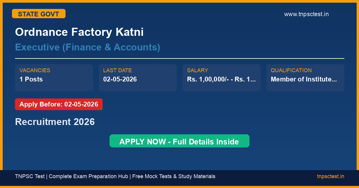 Ordnance Factory Katni has released an official recruitment notification for the post of Executive (Finance & Accounts). A total of 1 vacancies have been announced for this state government recruitment 2026. Candidates who have completed Member of Institute of Chartered Accountants of India (ICAI), Member of Institute of Cost Accountants of India (ICMAI), Minimum 2 years relevant post qualification experience in financial management, Ind AS, TALLY etc. from a recognized university or institution are eligible to apply. The last date to submit the online application is 02-05-2026. Read below for complete details on eligibility criteria, application fee, selection process, salary, and how to apply for this Ordnance Factory Katni recruitment.