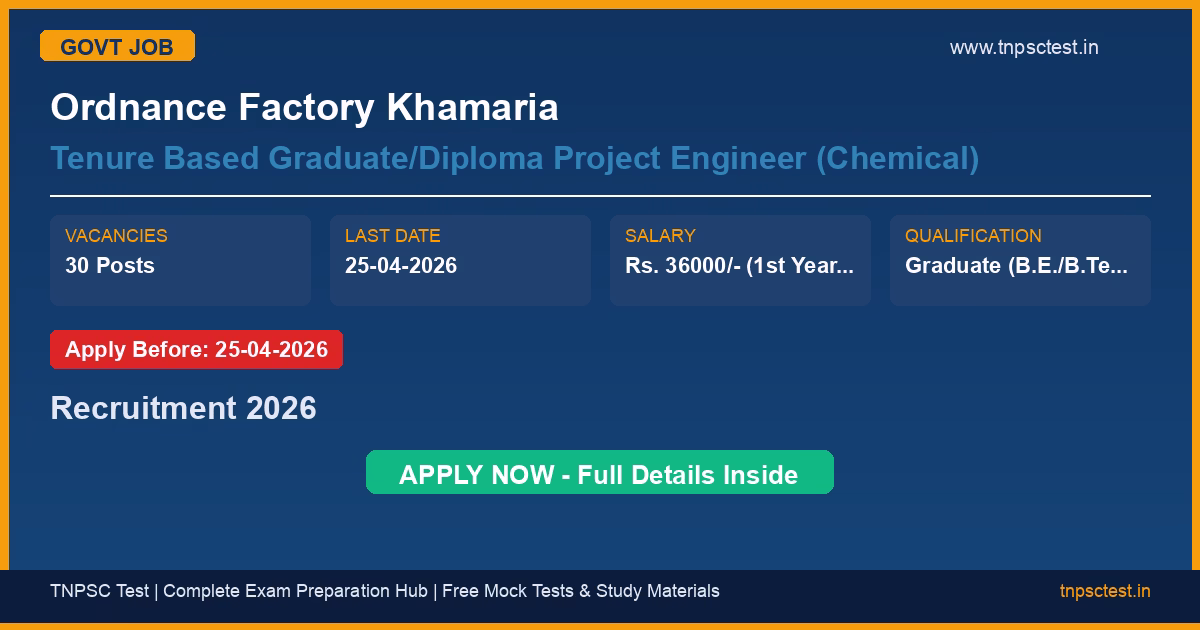 Ordnance Factory Khamaria has released an official recruitment notification for the post of Tenure Based Graduate/Diploma Project Engineer (Chemical). A total of 30 vacancies have been announced for this government recruitment 2026. Candidates who have completed Graduate (B.E./B.Tech) or Diploma in Chemical Engineering with Apprenticeship in manufacturing/handling of ammunition and explosives. from a recognized university or institution are eligible to apply. The last date to submit the online application is 25-04-2026. Read below for complete details on eligibility criteria, application fee, selection process, salary, and how to apply for this Ordnance Factory Khamaria recruitment.