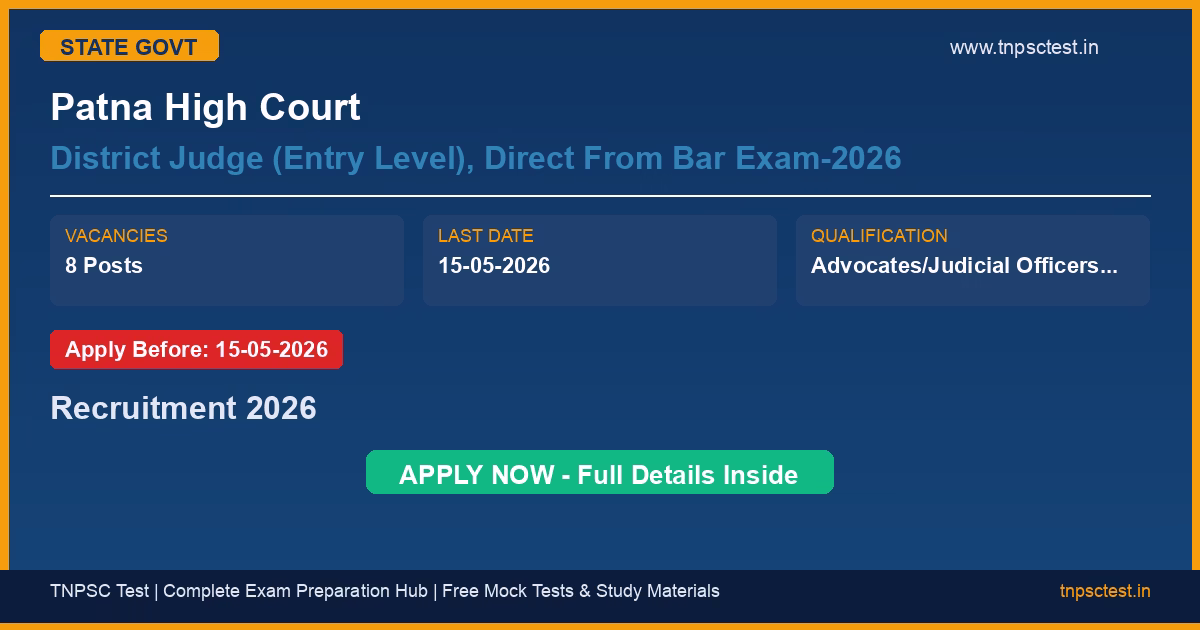 Patna High Court has released an official recruitment notification for the post of District Judge (Entry Level), Direct From Bar Exam-2026. A total of 8 vacancies have been announced for this state government recruitment 2026. Candidates who have completed Advocates/Judicial Officers with 7 years of practice or more. from a recognized university or institution are eligible to apply. The last date to submit the online application is 15-05-2026. Read below for complete details on eligibility criteria, application fee, selection process, salary, and how to apply for this Patna High Court recruitment.