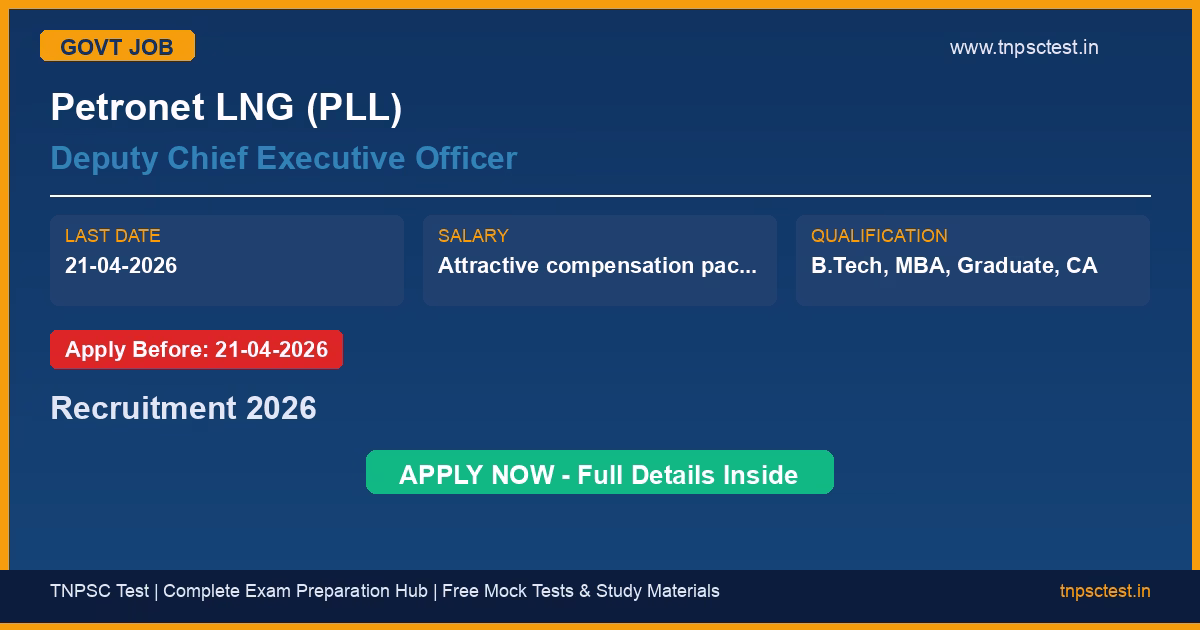 Petronet LNG (PLL) has released an official recruitment notification for the post of Deputy Chief Executive Officer. Candidates who have completed B.Tech, MBA, Graduate, CA from a recognized university or institution are eligible to apply. The last date to submit the online application is 21-04-2026. Read below for complete details on eligibility criteria, application fee, selection process, salary, and how to apply for this Petronet LNG (PLL) recruitment.