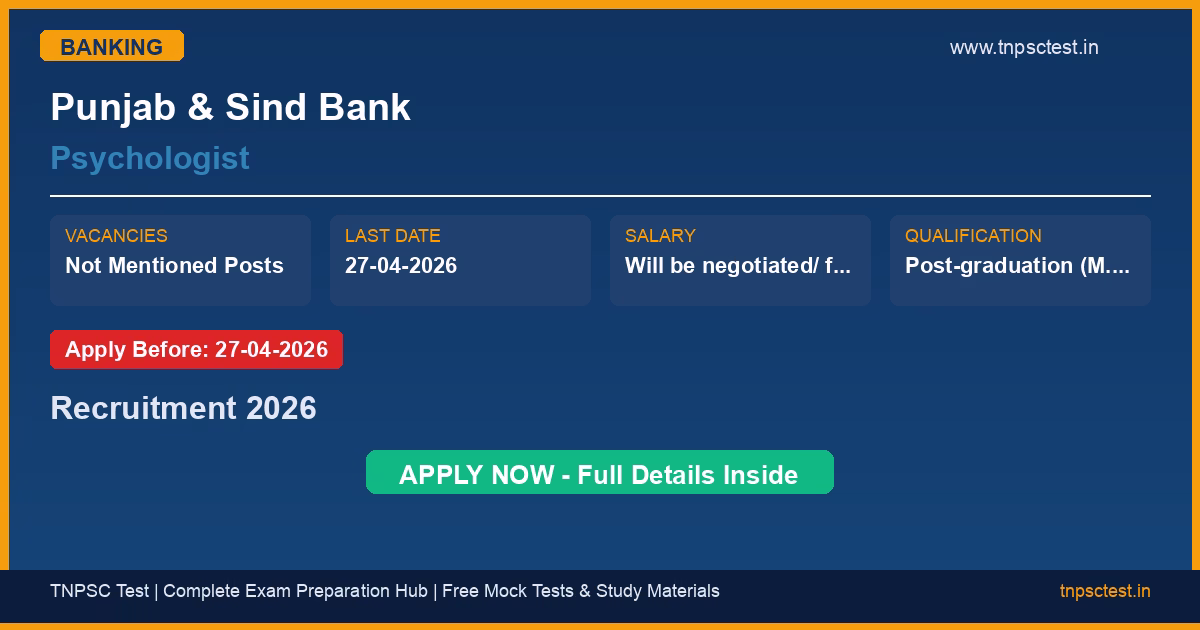 Punjab & Sind Bank has released an official recruitment notification for the post of Psychologist. A total of Not Mentioned vacancies have been announced for this banking recruitment 2026. Candidates who have completed Post-graduation (M.A) in Psychology. Preference will be given to candidates having or pursuing PhD/ M.Phil in Psychology. from a recognized university or institution are eligible to apply. The last date to submit the online application is 27-04-2026. Read below for complete details on eligibility criteria, application fee, selection process, salary, and how to apply for this Punjab & Sind Bank recruitment.