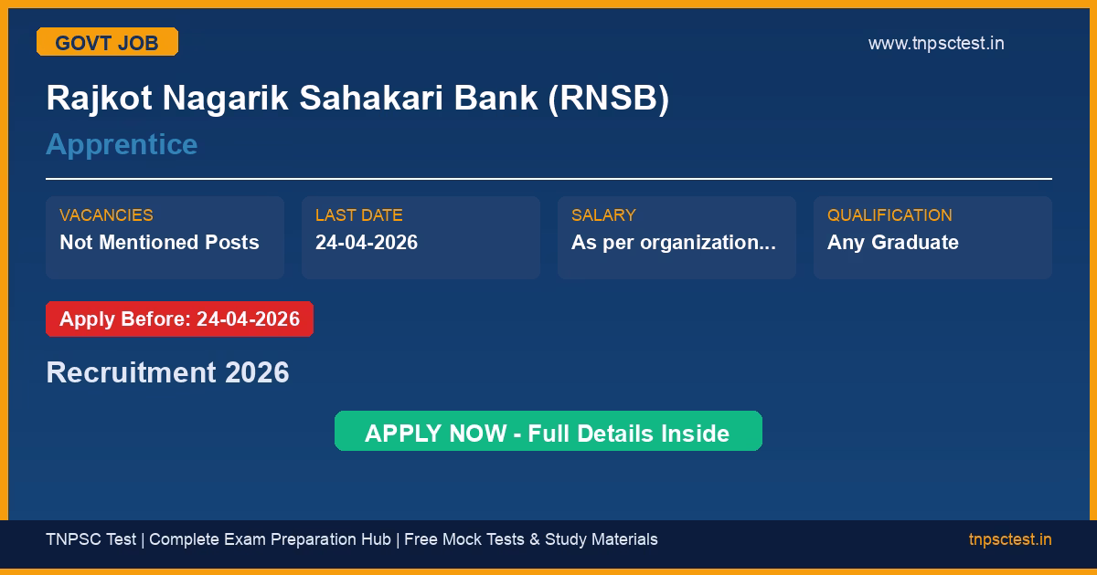 Rajkot Nagarik Sahakari Bank (RNSB) has released an official recruitment notification for the post of Apprentice. A total of Not Mentioned vacancies have been announced for this government recruitment 2026. Candidates who have completed Any Graduate from a recognized university or institution are eligible to apply. The last date to submit the online application is 24-04-2026. Read below for complete details on eligibility criteria, application fee, selection process, salary, and how to apply for this Rajkot Nagarik Sahakari Bank (RNSB) recruitment.