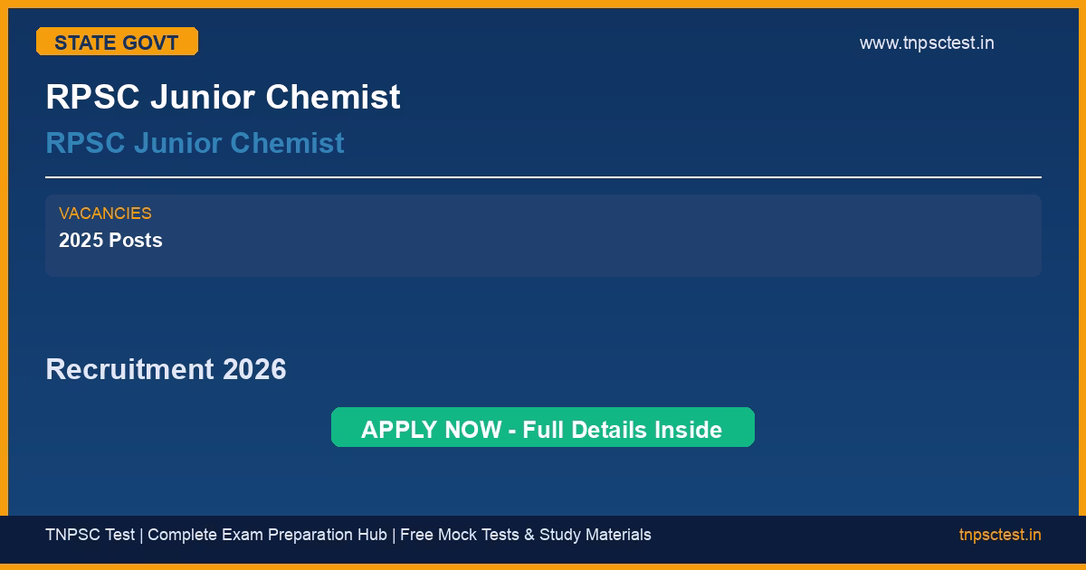 RPSC Junior Chemist has released an official recruitment notification for the post of RPSC Junior Chemist. A total of RPSC Junior Chemist Recruitment 2025 : Vacancy Details Total : 13 Post vacancies have been announced for this state government recruitment 2026. Read below for complete details on eligibility criteria, application fee, selection process, salary, and how to apply for this RPSC Junior Chemist recruitment.