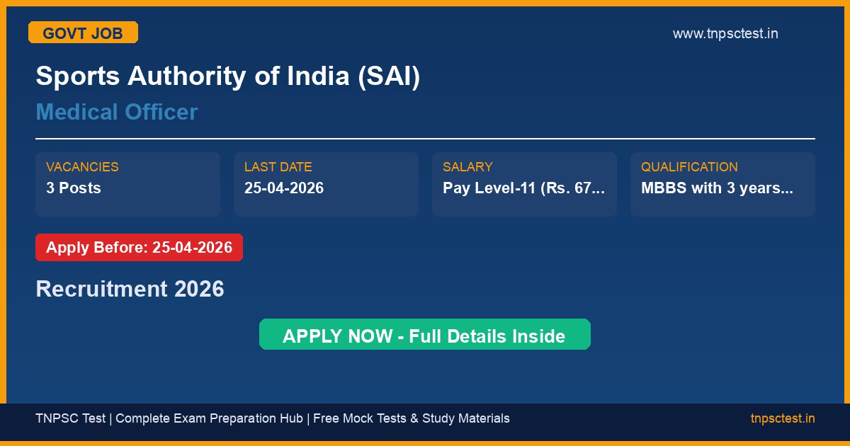 Sports Authority of India (SAI) has released an official recruitment notification for the post of Medical Officer. A total of 3 vacancies have been announced for this government recruitment 2026. Candidates who have completed MBBS with 3 years experience or PGDSM with 1 year experience or PG/DNB in Sports medicine/Orthopaedics/PMR/equivalent. from a recognized university or institution are eligible to apply. The last date to submit the online application is 25-04-2026. Read below for complete details on eligibility criteria, application fee, selection process, salary, and how to apply for this Sports Authority of India (SAI) recruitment.