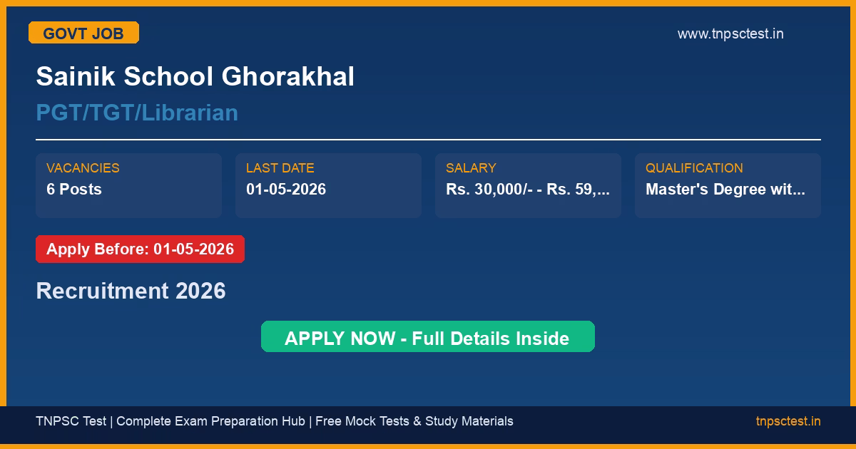 Sainik School Ghorakhal has released an official recruitment notification for the post of PGT/TGT/Librarian. A total of 6 vacancies have been announced for this government recruitment 2026. Candidates who have completed Master’s Degree with 50% marks, B.Ed, CTET Paper II, Graduate with Library Science Diploma from a recognized university or institution are eligible to apply. The last date to submit the online application is 01-05-2026. Read below for complete details on eligibility criteria, application fee, selection process, salary, and how to apply for this Sainik School Ghorakhal recruitment.