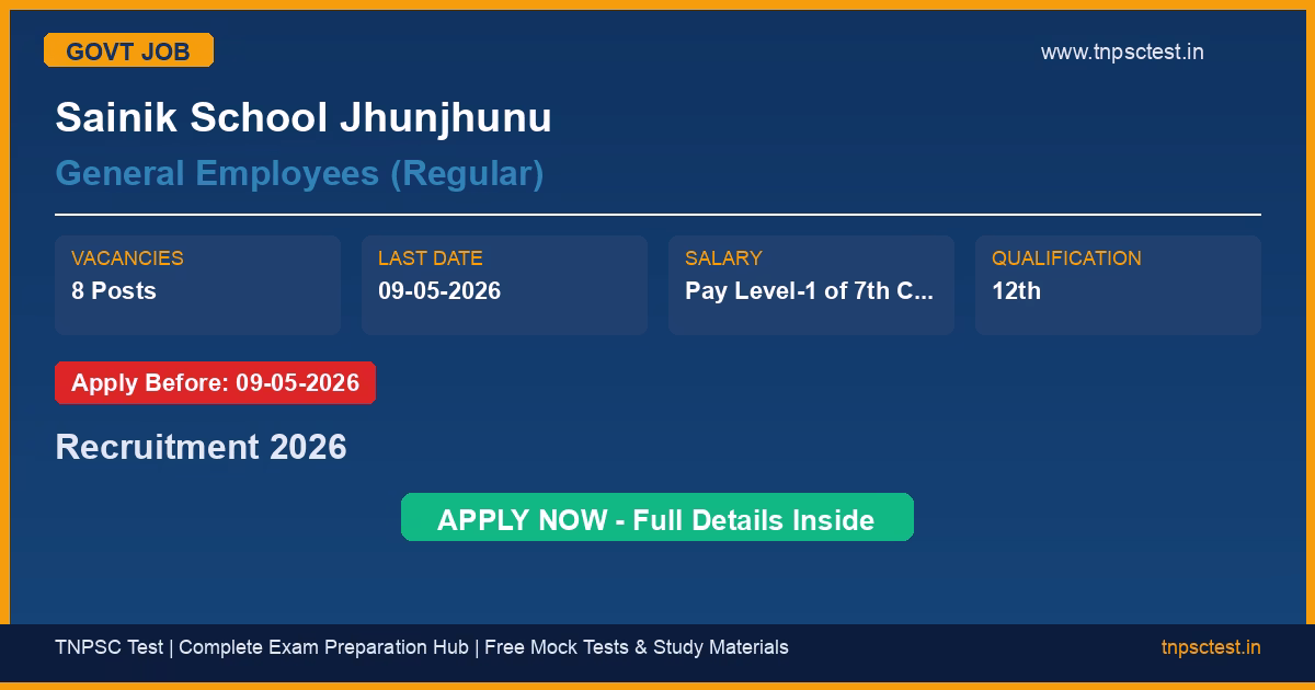 Sainik School Jhunjhunu has released an official recruitment notification for the post of General Employees (Regular). A total of 8 vacancies have been announced for this government recruitment 2026. Candidates who have completed 12th from a recognized university or institution are eligible to apply. The last date to submit the online application is 09-05-2026. Read below for complete details on eligibility criteria, application fee, selection process, salary, and how to apply for this Sainik School Jhunjhunu recruitment.