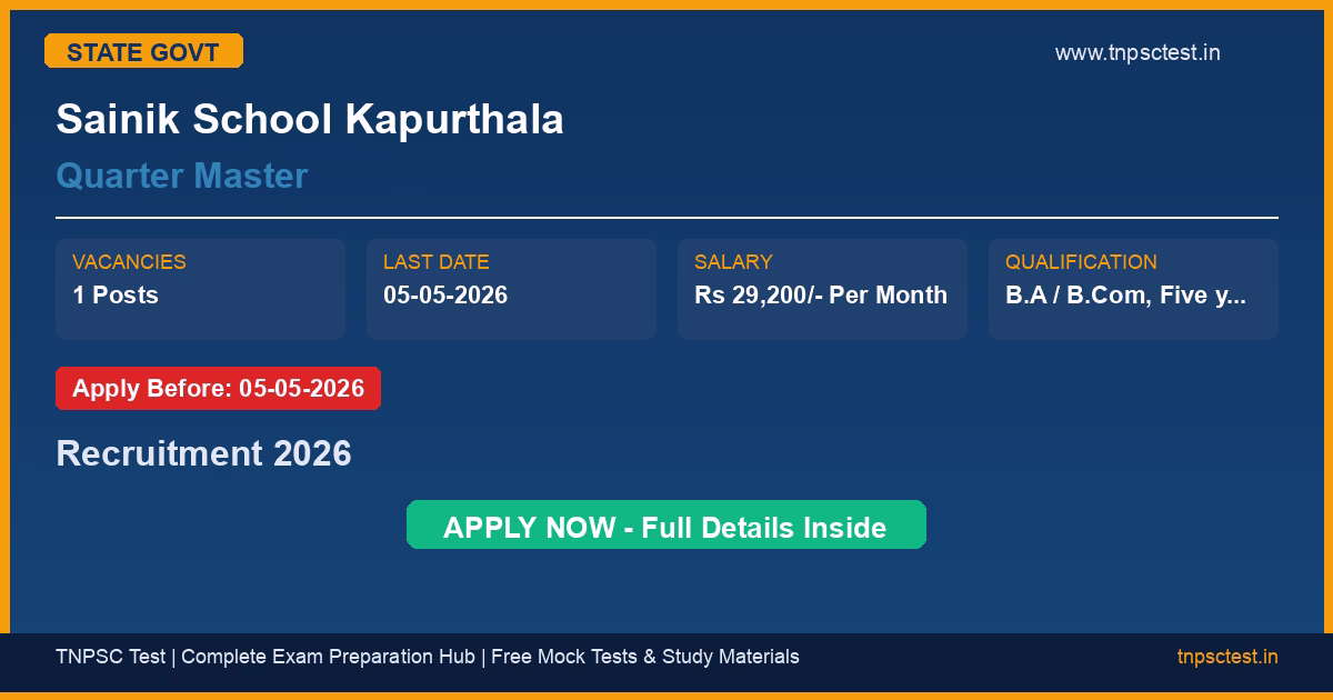Sainik School Kapurthala has released an official recruitment notification for the post of Quarter Master. A total of 1 vacancies have been announced for this state government recruitment 2026. Candidates who have completed B.A / B.Com, Five years experience as UDC (Stores) or Quarter Master or ex-serviceman (JCO with 10 years stores experience preferred), Desirable: Quarter Master’s course, Desirable: Knowledge of GeM, CPP, GFR, DPM, DFPDS, Desirable: MS Office from a recognized university or institution are eligible to apply. The last date to submit the online application is 05-05-2026. Read below for complete details on eligibility criteria, application fee, selection process, salary, and how to apply for this Sainik School Kapurthala recruitment.
