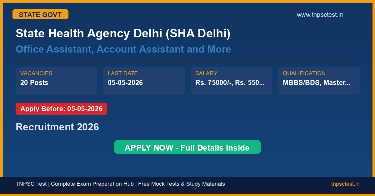 State Health Agency Delhi (SHA Delhi) has released an official recruitment notification for the post of Office Assistant, Account Assistant and More. A total of 20 vacancies have been announced for this state government recruitment 2026. Candidates who have completed MBBS/BDS, Master in Journalism, B.Tech/B.Engg/M.Tech/Masters, CA/MBA Finance, Graduate in Law, from a recognized university or institution are eligible to apply. The last date to submit the online application is 05-05-2026. Read below for complete details on eligibility criteria, application fee, selection process, salary, and how to apply for this State Health Agency Delhi (SHA Delhi) recruitment.