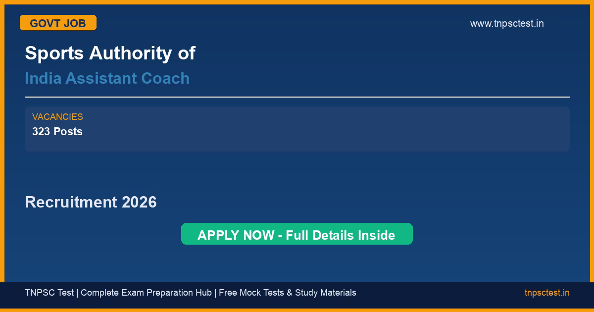 Sports Authority of India (SAI), Ministry of Youth Affairs & Sports has released an official recruitment notification for the post of Assistant Coach (26 Sports Disciplines). A total of 323 (UR:187, OBC:73, SC:32, ST:9, EWS:22) + 33% Horizontal Women Reservation vacancies have been announced for this government recruitment 2026. Candidates who have completed Diploma/Equivalent in Coaching from SAI NS-NIS Patiala or Recognized University; Max Age 30 Years (Relaxations Apply) from a recognized university or institution are eligible to apply. The last date to submit the online application is 21-04-2026. Read below for complete details on eligibility criteria, application fee, selection process, salary, and how to apply for this Sports Authority of India (SAI), Ministry of Youth Affairs & Sports recruitment.