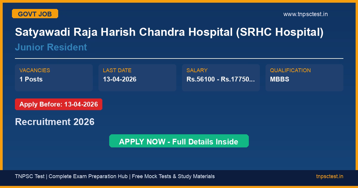 Satyawadi Raja Harish Chandra Hospital (SRHC Hospital) has released an official recruitment notification for the post of Junior Resident. A total of 1 vacancies have been announced for this government recruitment 2026. Candidates who have completed MBBS from a recognized university or institution are eligible to apply. The last date to submit the online application is 13-04-2026. Read below for complete details on eligibility criteria, application fee, selection process, salary, and how to apply for this Satyawadi Raja Harish Chandra Hospital (SRHC Hospital) recruitment.
