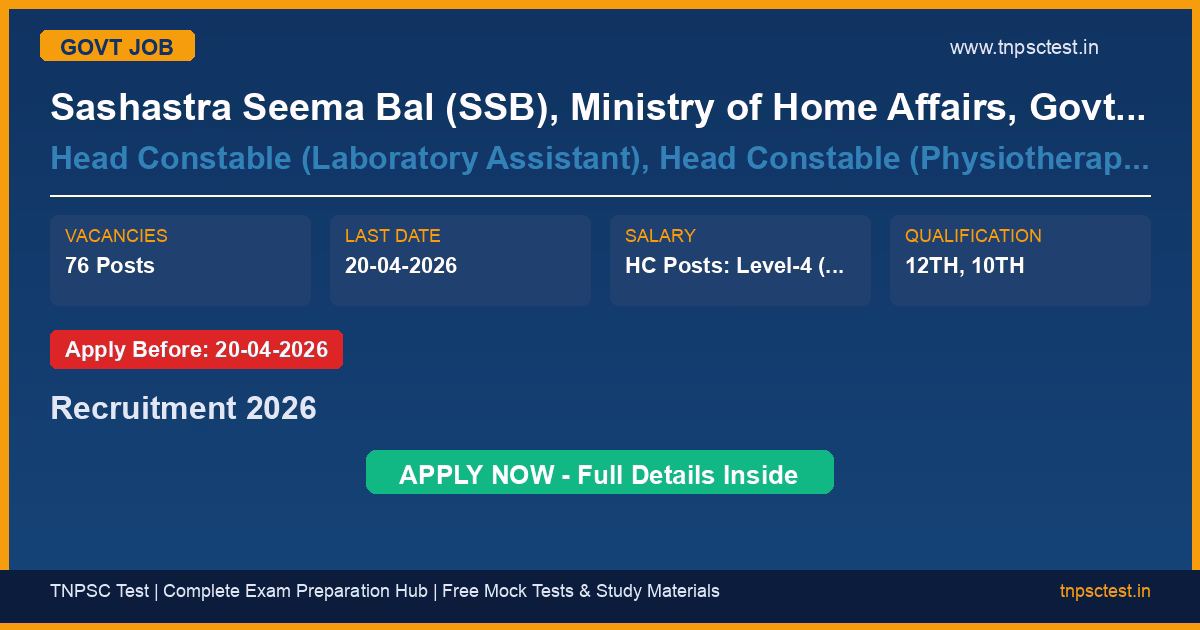 Sashastra Seema Bal (SSB), Ministry of Home Affairs, Govt. of India has released an official recruitment notification for the post of Head Constable (Laboratory Assistant), Head Constable (Physiotherapy Assistant), Constable (Nursing Assistant cum Medic). A total of 76 posts vacancies have been announced for this government recruitment 2026. Candidates who have completed 12TH, 10TH from a recognized university or institution are eligible to apply. The last date to submit the online application is 20-04-2026. Read below for complete details on eligibility criteria, application fee, selection process, salary, and how to apply for this Sashastra Seema Bal (SSB), Ministry of Home Affairs, Govt. of India recruitment.