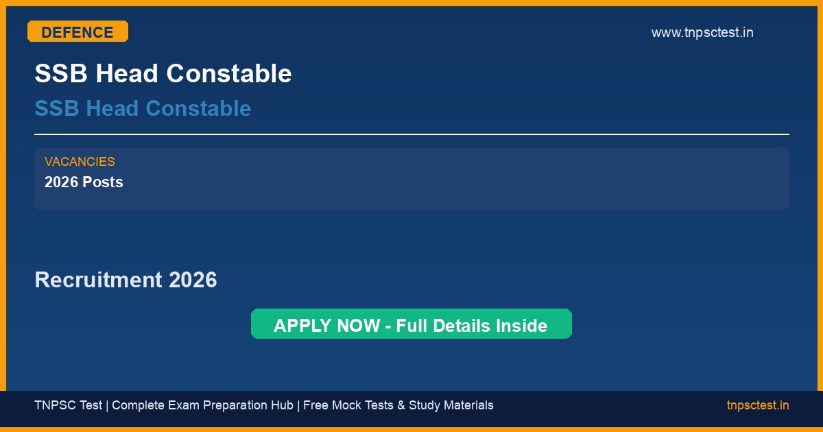 | Age | SSB Head Constable Notification 2026 : Age Limit as on 01/07/2026 Minimum Age : 18 Years Maximum Age : 25 Years for Head Constable (Electrician) Maximum Age : 27 Years for Steward, Communication & Veterinary Age Relaxation Extra as per Sashastra Seema Bal SSB Head Constable Examination 2026. |