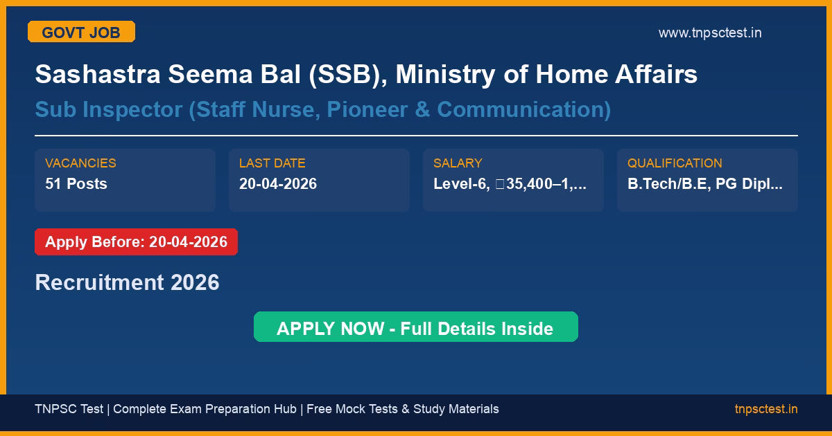 Sashastra Seema Bal (SSB), Ministry of Home Affairs has released an official recruitment notification for the post of Sub Inspector (Staff Nurse, Pioneer & Communication). A total of 51 posts vacancies have been announced for this government recruitment 2026. Candidates who have completed B.Tech/B.E, PG Diploma from a recognized university or institution are eligible to apply. The last date to submit the online application is 20-04-2026. Read below for complete details on eligibility criteria, application fee, selection process, salary, and how to apply for this Sashastra Seema Bal (SSB), Ministry of Home Affairs recruitment.