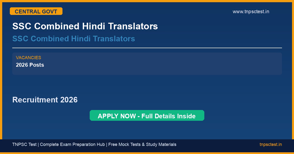 SSC Combined Hindi Translators has released an official recruitment notification for the post of SSC Combined Hindi Translators. A total of SSC Junior Hindi Translator JHT Recruitment 2026 : Vacancy Details Total : 84 Post vacancies have been announced for this central government recruitment 2026. Read below for complete details on eligibility criteria, application fee, selection process, salary, and how to apply for this SSC Combined Hindi Translators recruitment.