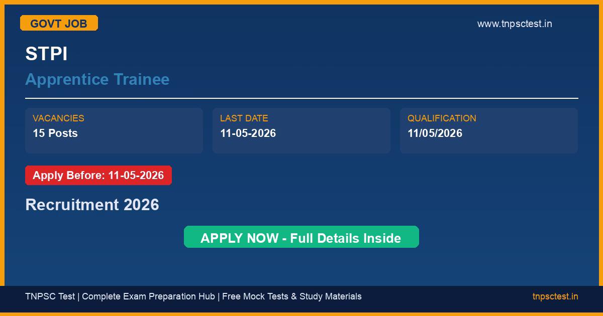 STPI has released an official recruitment notification for the post of Apprentice Trainee. A total of 15 Posts vacancies have been announced for this government recruitment 2026. Candidates who have completed 11/05/2026 from a recognized university or institution are eligible to apply. The last date to submit the online application is 11-05-2026. Read below for complete details on eligibility criteria, application fee, selection process, salary, and how to apply for this STPI recruitment.