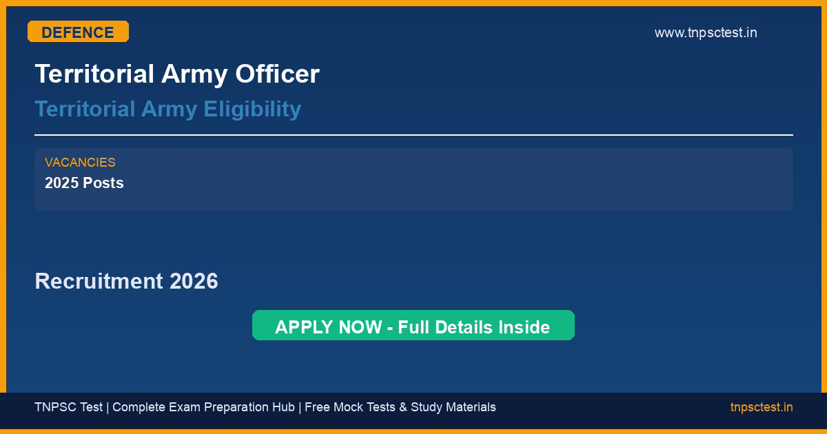Territorial Army Officer has released an official recruitment notification for the post of Territorial Army Eligibility. A total of Territorial Army Recruitment 2025 : Vacancy Details Total 19 Post Male : 18 Post | Female : 01 Post vacancies have been announced for this defence recruitment 2026. Read below for complete details on eligibility criteria, application fee, selection process, salary, and how to apply for this Territorial Army Officer recruitment.