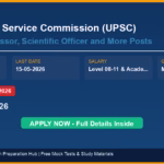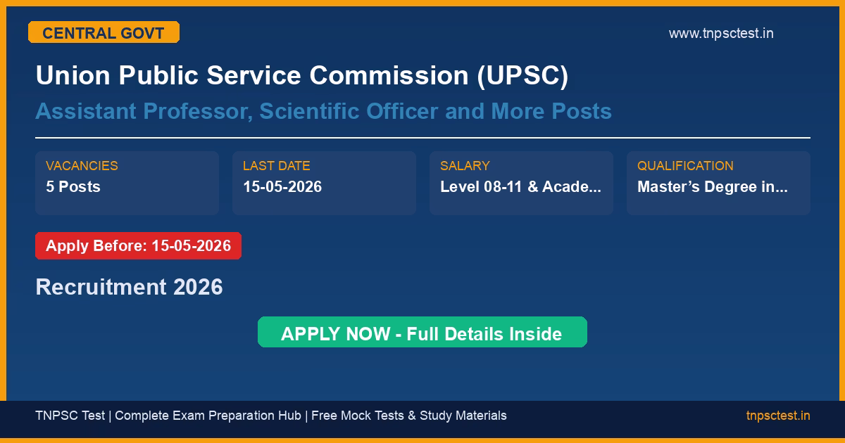 Union Public Service Commission (UPSC) has released an official recruitment notification for the post of Assistant Professor, Scientific Officer and More Posts. A total of 5 vacancies have been announced for this central government recruitment 2026. Candidates who have completed Master’s Degree in Physics, B.E./B.Tech in Mechanical/Metallurgical Engineering, B.E./B.Tech in Electrical/Mechanical/Metallurgy, Bachelor’s Degree in Civil Engineering, B.E./B.Tech in Civil Engineering + M.E./M.Tech in Civil Engineering (Geo Informatics / Geoinformatics and Surveying Technology) from a recognized university or institution are eligible to apply. The last date to submit the online application is 15-05-2026. Read below for complete details on eligibility criteria, application fee, selection process, salary, and how to apply for this Union Public Service Commission (UPSC) recruitment.