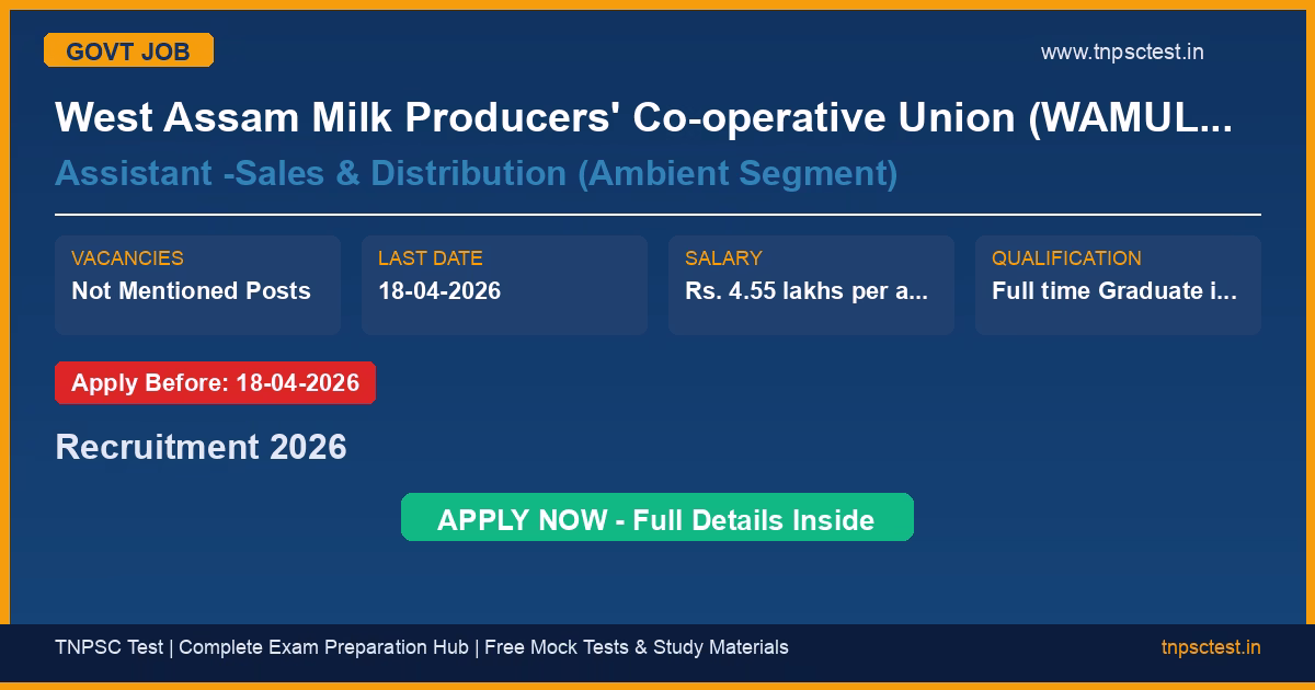 West Assam Milk Producers’ Co-operative Union (WAMUL Purabi Dairy) has released an official recruitment notification for the post of Assistant -Sales & Distribution (Ambient Segment). A total of Not Mentioned vacancies have been announced for this government recruitment 2026. Candidates who have completed Full time Graduate in any discipline from a recognized Institute/University. from a recognized university or institution are eligible to apply. The last date to submit the online application is 18-04-2026. Read below for complete details on eligibility criteria, application fee, selection process, salary, and how to apply for this West Assam Milk Producers’ Co-operative Union (WAMUL Purabi Dairy) recruitment.