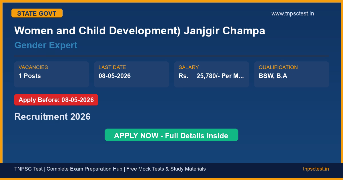 Women and Child Development) Janjgir Champa has released an official recruitment notification for the post of Gender Expert. A total of 1 vacancies have been announced for this state government recruitment 2026. Candidates who have completed BSW, B.A from a recognized university or institution are eligible to apply. The last date to submit the online application is 08-05-2026. Read below for complete details on eligibility criteria, application fee, selection process, salary, and how to apply for this Women and Child Development) Janjgir Champa recruitment.